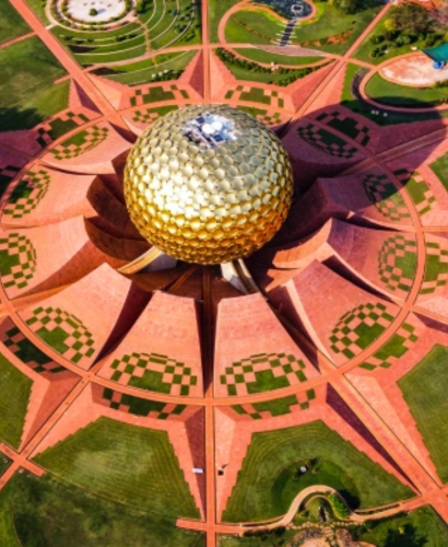 Explore the world-renowned township of Auroville and its golden Matrimandir — a peaceful retreat surrounded by lush greenery and artful spaces.